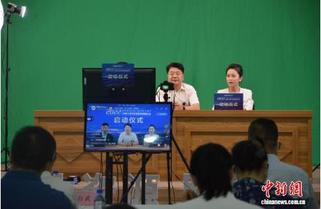 图为在兰州市“人社局长直播带岗暖心行动”启动仪式上,兰州市人社局副局长臧晓平(右二)在直播现场与网友互动。(资料图)李亚龙 摄